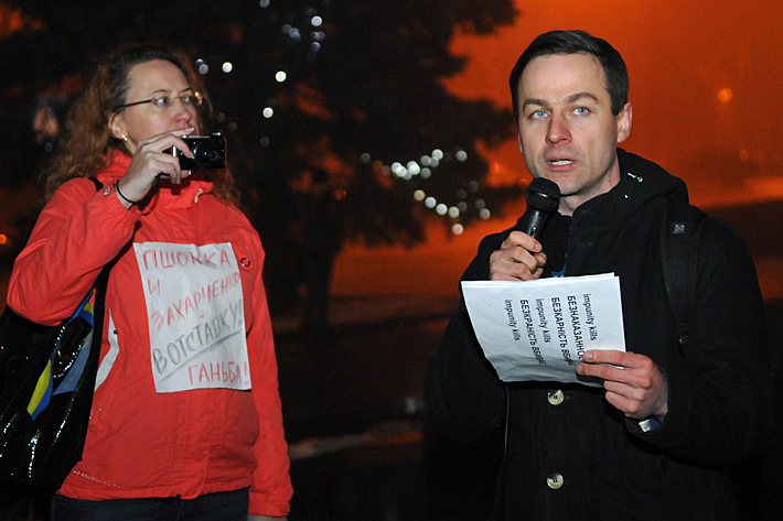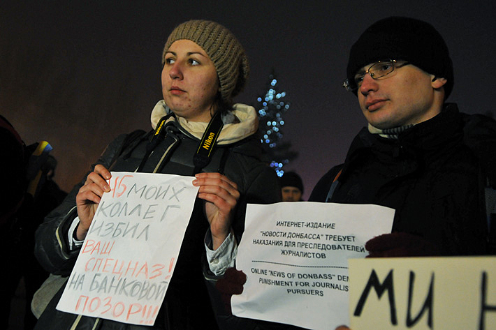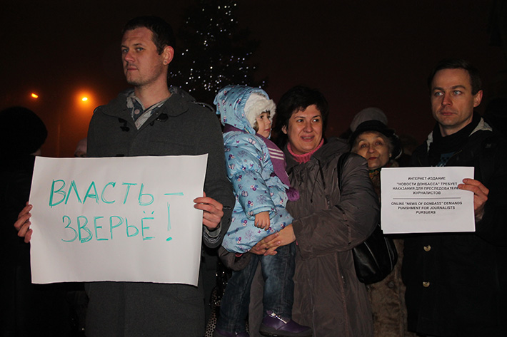 Несколько десятков представителей СМИ вышли на донецкий Евромайдан к памятнику поэту Тарасу Шевченко. В руках у журналистов были самодельные плакаты с требованием отставки Виталия Захарченко и генерального прокурора Украины Виктора Пшонки. Всего на донецком Евромайдане собралось более ста человек.