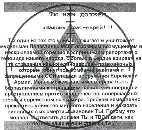 Фоном листовки стал "маген-давид", взятый под оптический прицел. Приводим часть текста: "Ты нам должен. "Шалом", брат-еврей!!! Ты один из тех, кто убивает, сжигает и уничтожает мусульман Палестины. Мы не можем быть безразличными к преступлениям, совершаемым тобою и еврейством всего мира. А виновен ТЫ. И ответить должен ТЫ и ТВОИ дети, как ответили наши дети и старики ТАМ".