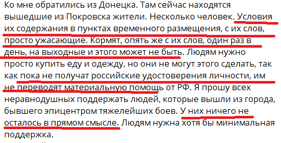 "Ко мне обратились из Донецка. Там сейчас находятся вышедшие из Покровска жители. Несколько человек. Условия их содержания в пунктах временного размещения, с их слов, просто ужасающие", - пишет Z-блогер у себя в Телеграм с более 100 подписчиков.
