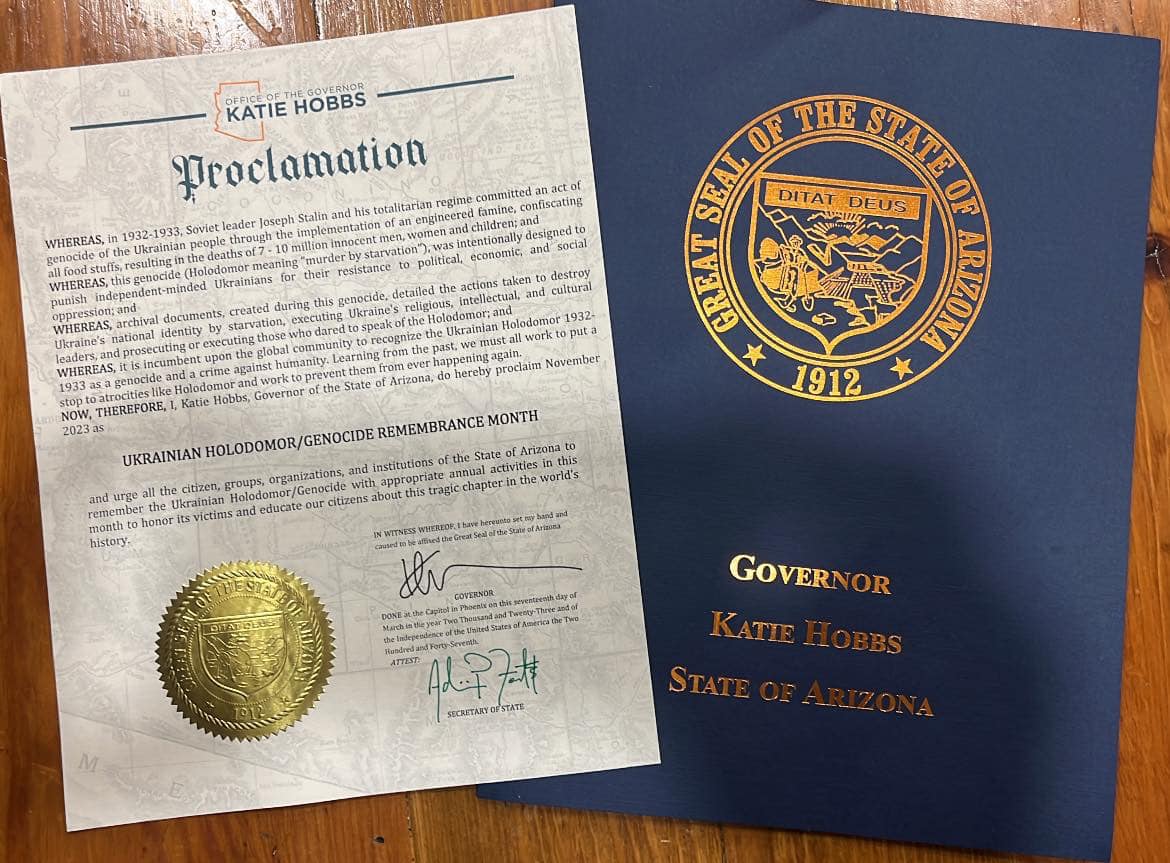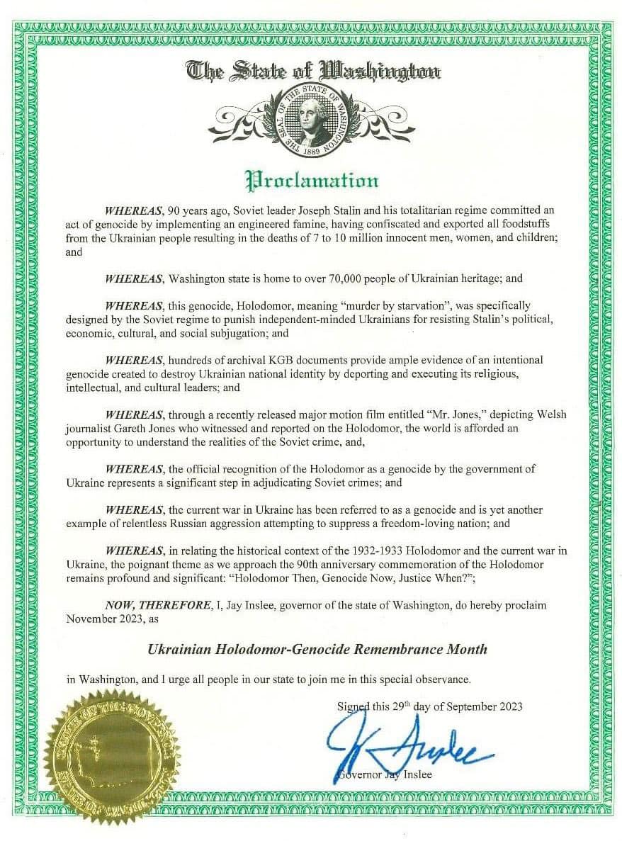 "По состоянию на сегодня уже 31 американский штат выдал соответствующие прокламации о признании Голодомора геноцидом. Спасибо губернатору штата Вашингтон Джею Инсли, губернатору штата Мэриленд Вэсу Муру, губернатору Аризоны Кэти Хобс за солидарность с Украиной", - пишет Маркарова.