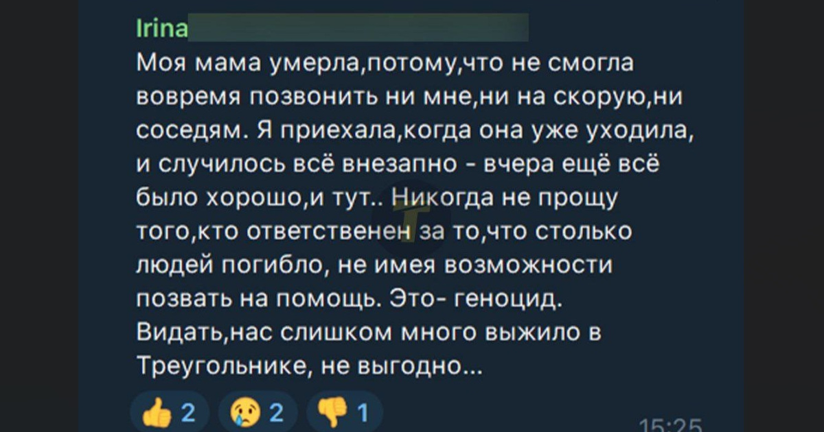 "Моя мама умерла, потому что не смогла вовремя позвонить ни мне, ни на скорую, ни соседям", - написала в одном из чатов оккупированного Лисичанска местная жительница. Скрин сообщения опубликовал Телеграм-канал "Трикутник" 23 декабря.