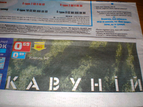 Реклама в спецвыпуске "Газеты по-киевски" сообщает, что арбузы под брэндом "Кавуний" подешевели. Киев, 18 сентября 2009 года