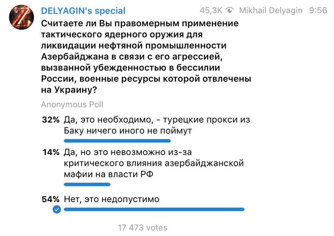 Депутат Госдумы РФ Михаил Делягин в своём телеграм-канале интересуется мнением россиян: поддерживают ли они ядерный удар по Азербайджану