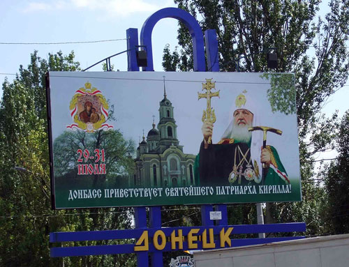 На улицах Донецка появились бигборды, приветствующие предстоящий визит в Донецкую область Патриарха Московского и всея Руси Кирилла. Донецк, 23 июля 2009 г.