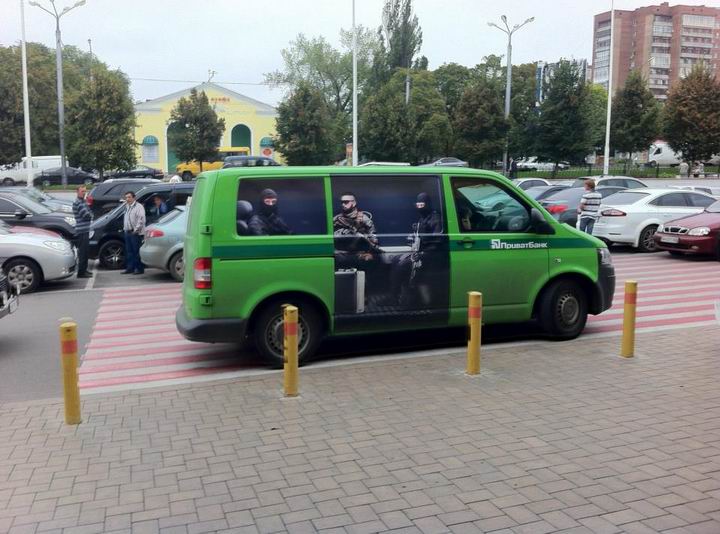 Инкассаторскую машину одного из банков украсили изображением вооруженной охраны. Донецк, 30 августа 2012 года