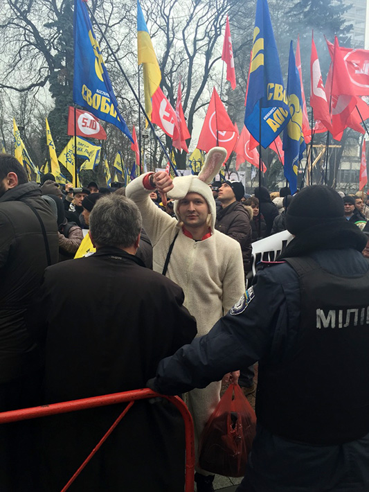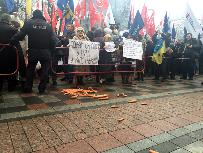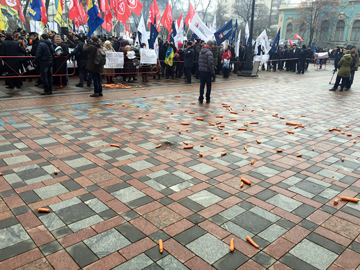 Митингующие забросали крыльцо Верховной Рады морковкой, требуя отставки Яценюка. Киев, 11 декабря 2015 года
