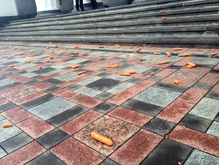 ФОТОФАКТ. Крыльцо Верховной Рады забросали морковкой, требуя отставки Яценюка