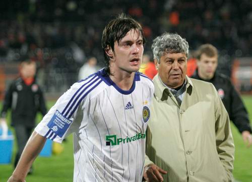 Главный тренер ФК "Шахтер" Мирча Луческу и игрок киевского "Динамо" Артем Милевский во время полуфинального матча на Кубок Украины.