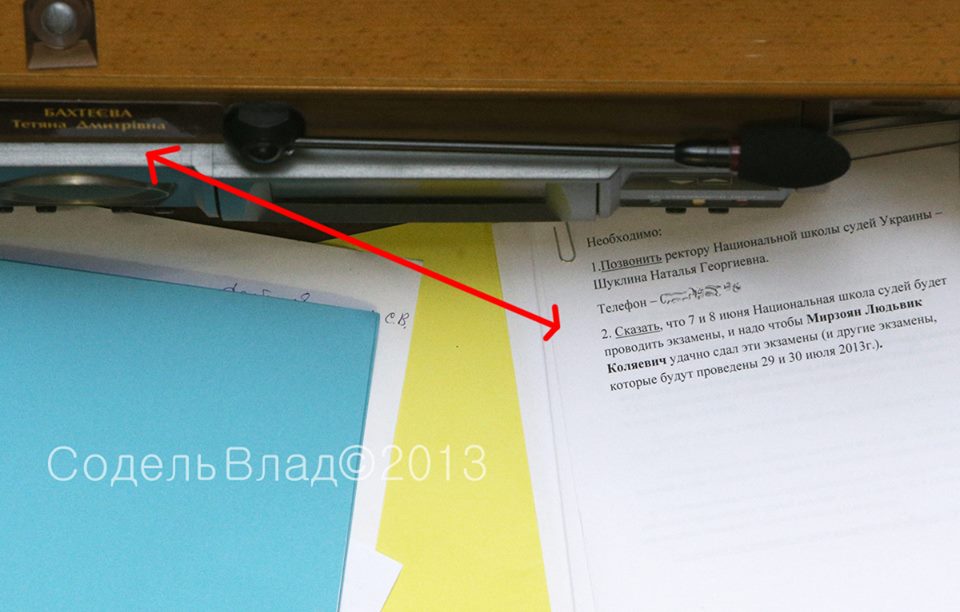 Фотограф Влад Содель сделал фотографии записей народного депутата Татьяны Бахтеевой, лежащих на ее столе, из которых следует, что она намерена помочь донецкому адвокату Людвику Коляевичу Мирзояну успешно сдать экзамены в Национальной школе судей. Киев Верховная Рада, 7 июня