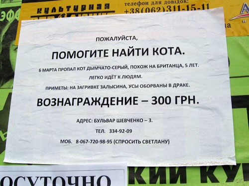 Безутешная хозяйка пропавшего кота обещает вознаграждение тому, кто вернет ей ее любимца.
