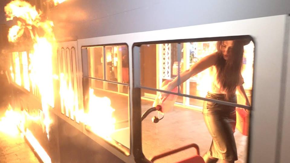 ФОТОФАКТ. С голой грудью на трамвай. В Виннице активистка Femen подожгла рекламную локацию магазина Roshen