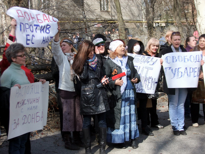 Кроме баррикад от возможного штурма захваченное сепаратистами здание СБУ "живым щитом" защищают местные жители. Донецк, 7 апреля 2014 года