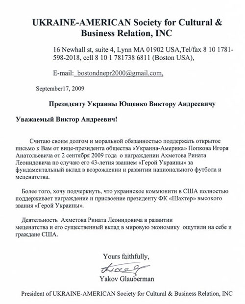 Президент общества «Украина-Америка» Яков Глауберман просит президента Украины Виктора Ющенко присвоить президенту ФК «Шахтер» Ринату Ахметову звание «Герой Украины».