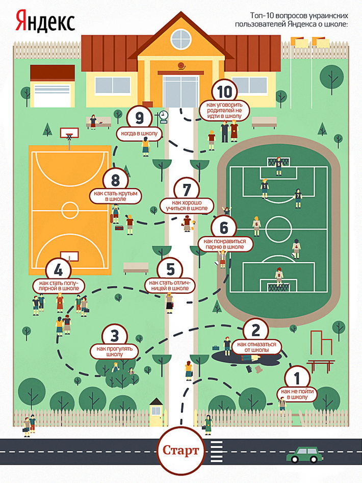 За последний год украинцы задали Яндексу почти миллион запросов о школе. Судя по поисковым запросам, большинство из них были заданы самими школьниками. В частности, донецких учеников интересовало, как прогулять школу, как повысить свою популярность среди одноклассников и что делать, если родителей вызвали к директору, - сообщили в пресс-службе компании "Яндекс.Украина".