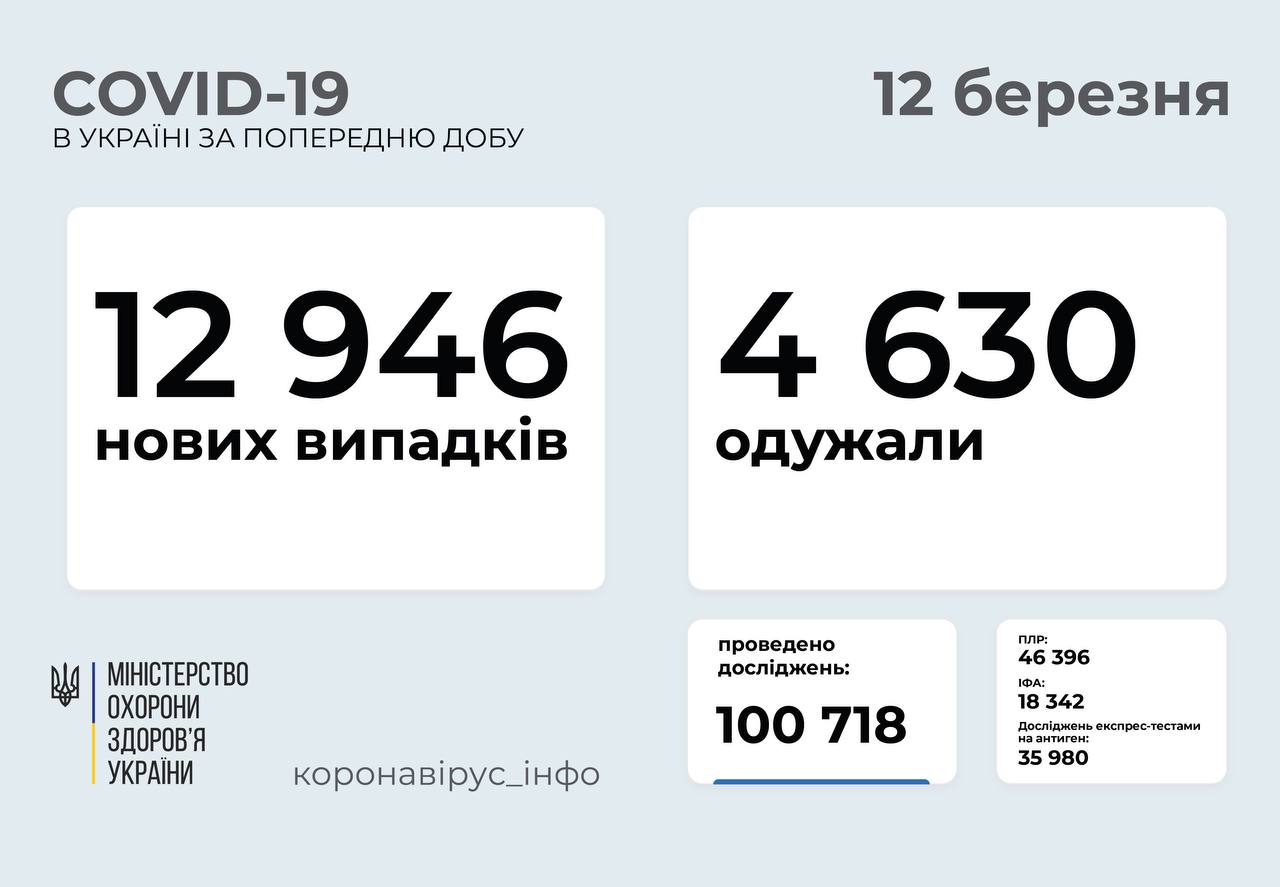 В Украине за прошлые сутки зафиксированы 12 946 новых случаев коронавирусной болезни COVID-19. Об этом сообщает министр здравоохранения Максим Степанов в Facebook.