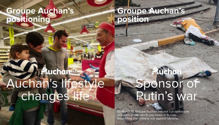 Он подчеркнул, что Auchan своим отказом прекратить бизнес в России "сознательно выбирает дальнейшее спонсирование российских злодеяний в Украине", подчеркнул Кулеба. Он сопроводил свое сообщение красноречивым фото.