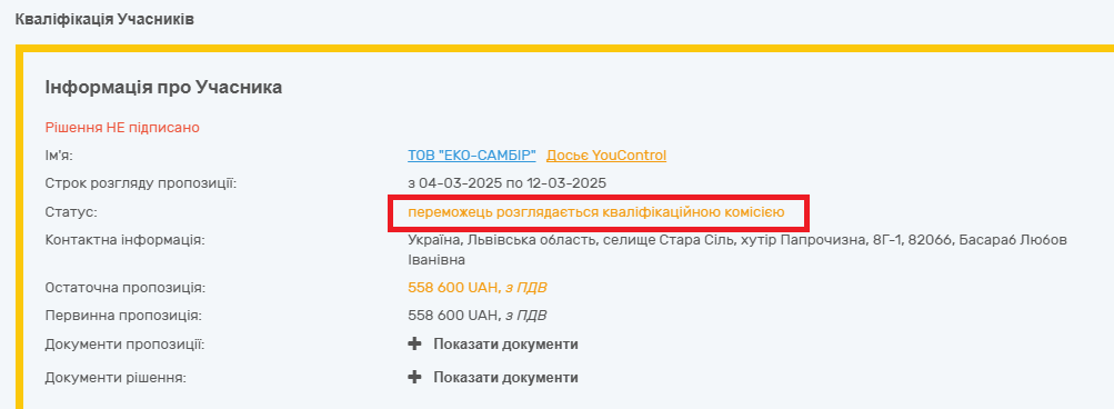 По состоянию на вечер 10 марта на площадке электронных торгов gov.e-tender.ua появилась информация, что "квалификационная комиссия отказала победителю".