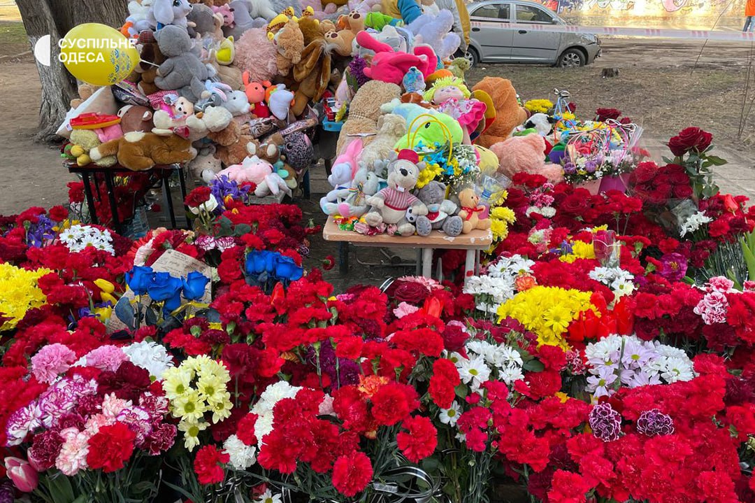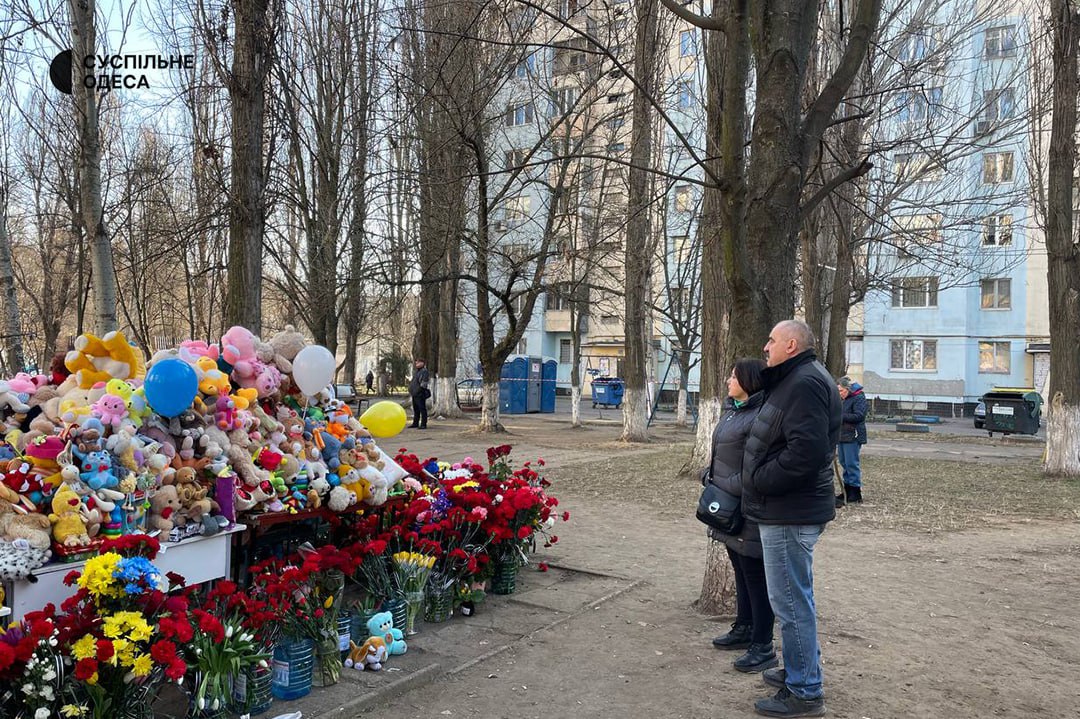 Люди продолжают приносить цветы и игрушки к дому, в котором из-за российской дроновой атаки погибли 12 человек, пятеро из которых - дети. Фото - Суспільне Одеса.