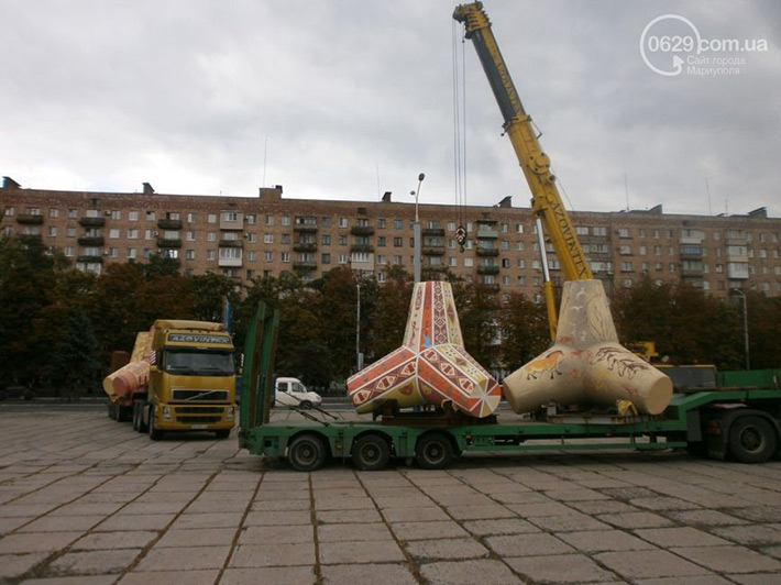 Тетраподы в качестве декоративного украшения установили на площади Ленина в Мариуполе 6 августа. Об этом сообщает 0629.