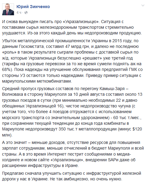 Зинченко отмечает: "Убыток металлургической промышленности Украины в 2015 году, по данным Госкомстата, составил 47 млрд грн, и далеко не последнюю «роль» в таком результате сыграли проблемы с доставкой сырья по ж/д, которые Укрзализныця безуспешно «решает» уже третий год (тарифы на грузовые перевозки за то же время сумели поднять аж на 68%). Пока надежды на улучшение обслуживания предприятий ГМК со стороны УЗ остаются только надеждами".