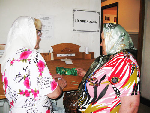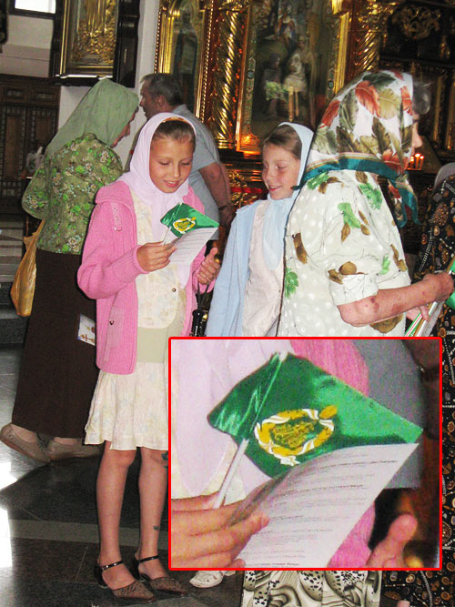 В Спасо-Преображенском соборе всем желающим раздают флажки с гербом покойного российского Патриарха Алексия Второго и листовки с программой пребывания Патриарха Кирилла в Украине.