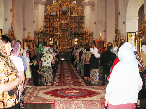 Верующие занимают места в храме, где по центру для Патриарха выложена красная дорожка. Некоторые прихожане принесли с собой цветы, которые они намерены подарить Святейшему "в знак уважения".
