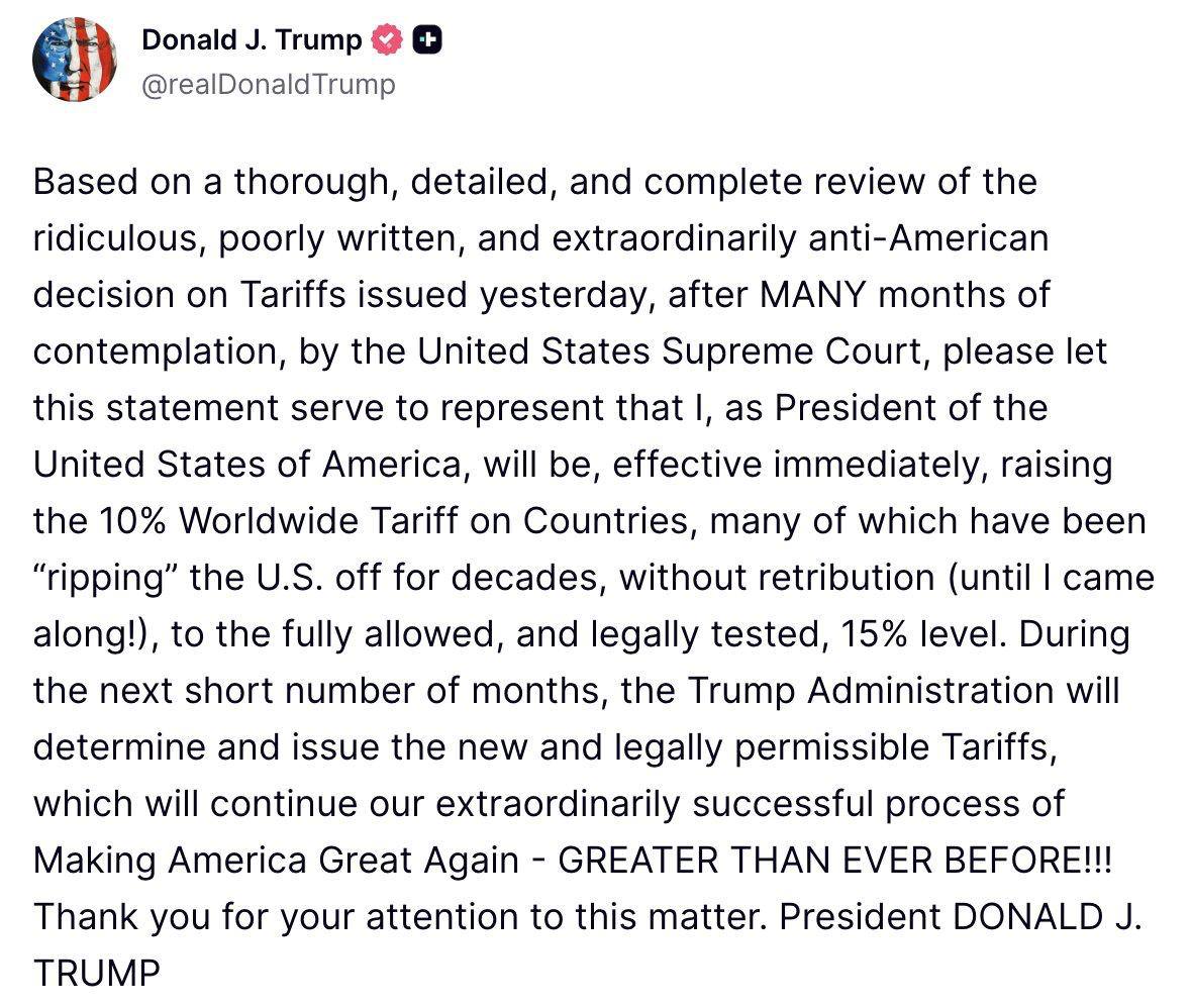 "Трамп повышает тарифы с 10% до 15% после решения Верховного суда США", - со ссылкой на пост президента США Дональда Трампа в его сети "Truth Social" пишет Телеграм-канал УНИАН 21 февраля.