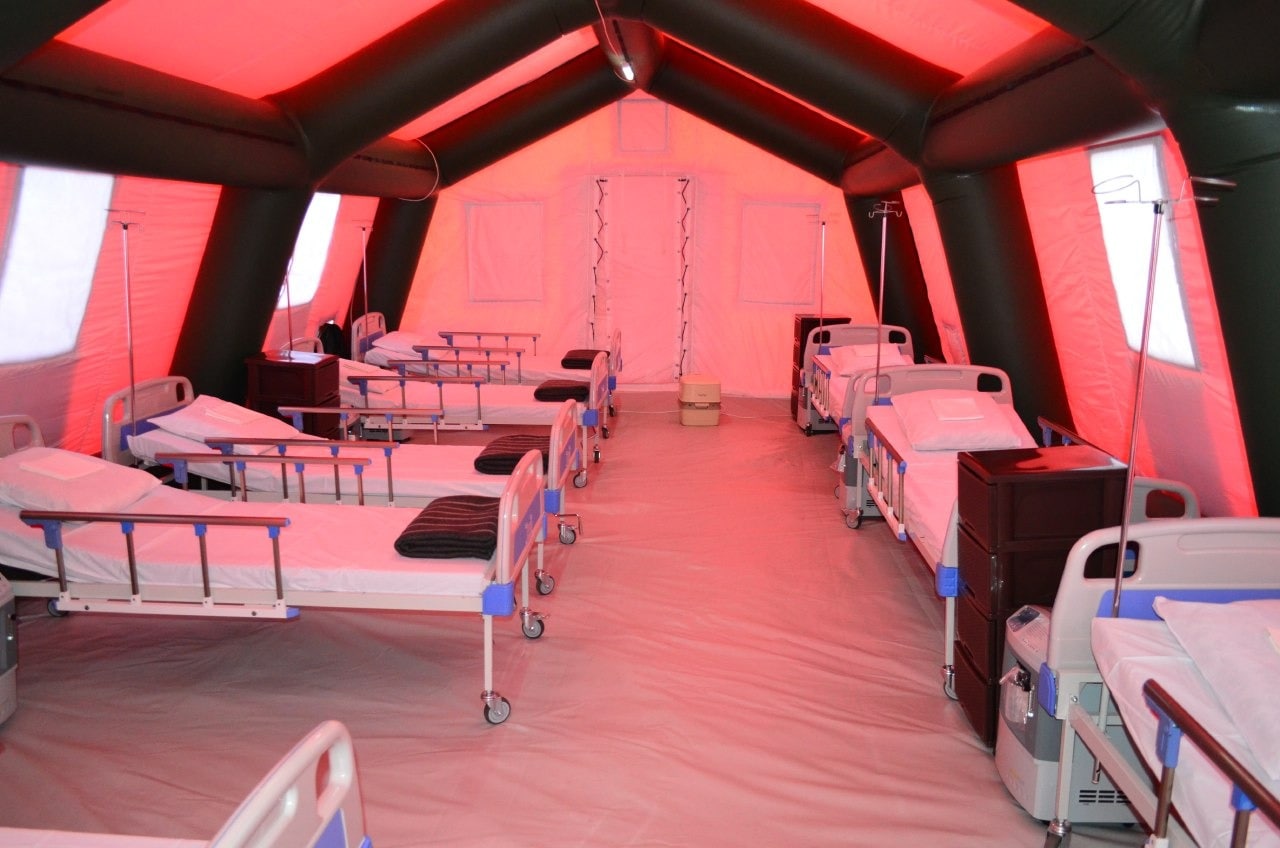Госпиталь состоит из 35 палаток, из которых 24 - это госпитальная база, рассчитанная на 120 коек. В госпитале работает блок интенсивной терапии и палаты для пациентов. Каждая кровать оборудована индивидуальным кислородным концентратором.