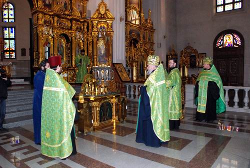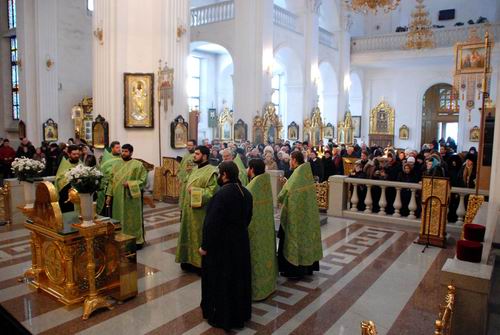 Ковчег с мощами встречало соборное духовенство во главе с благочинным Преображенского округа протоиереем Петром Устименко. Перед святыней был совершен молебен с чтением акафиста.