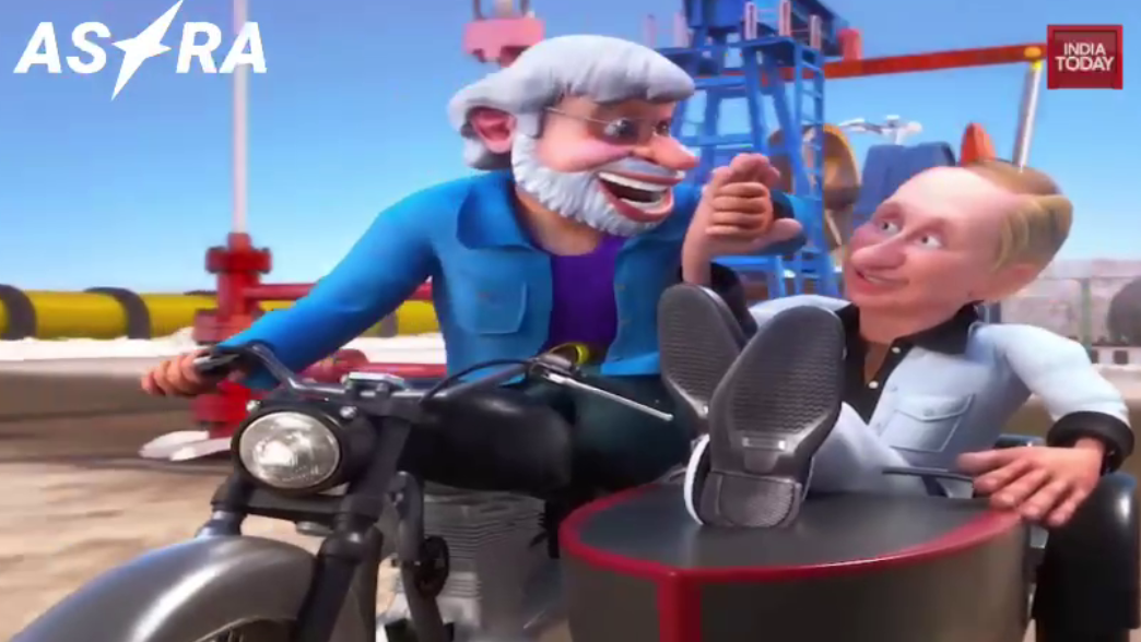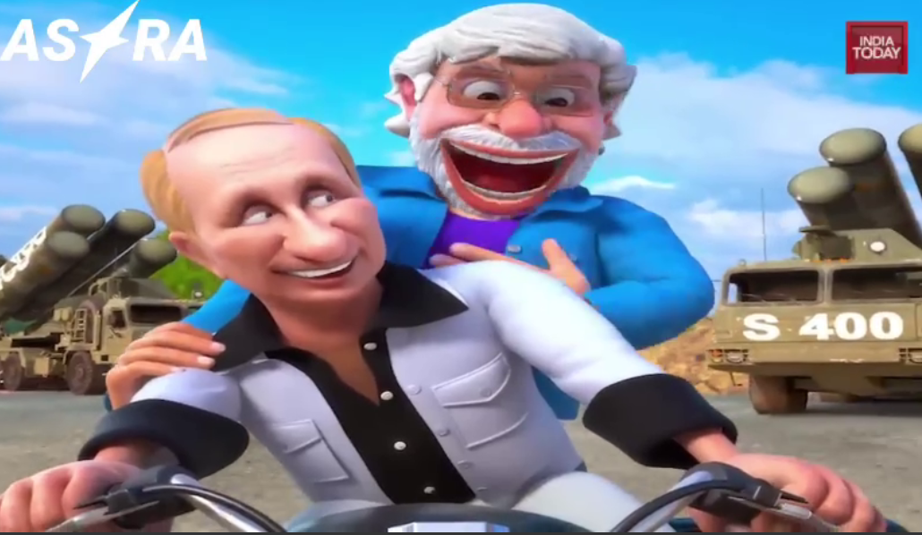 Телеканал India Today показал мультипликационный ролик, где Путин и премьер-министр Индии Нарендра Моди поют и танцуют на фоне нефтяных вышек и зенитно-ракетных комплексов С-400, которые Россия поставляет Индии.