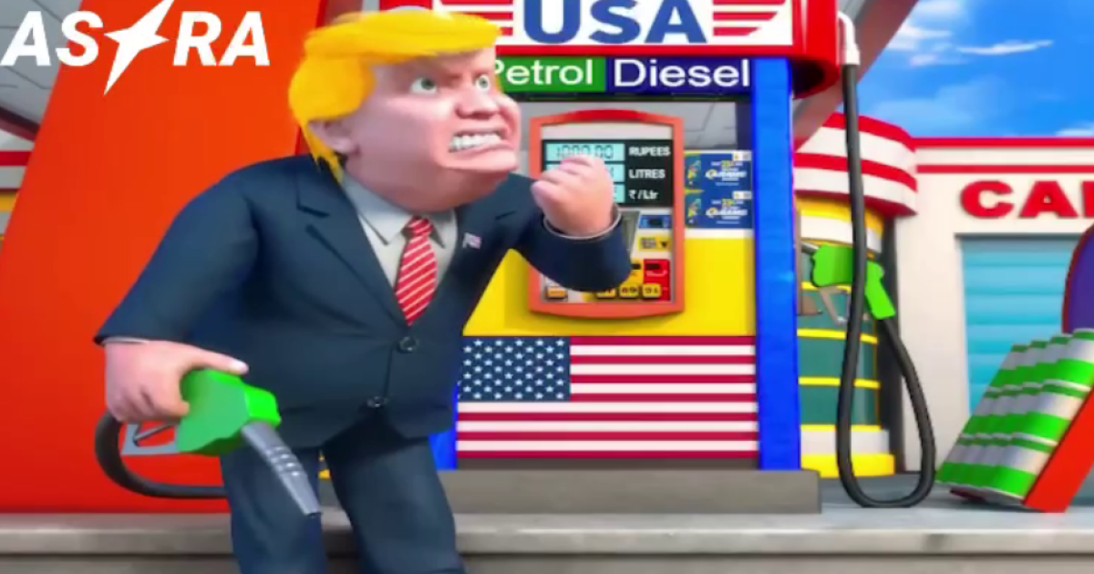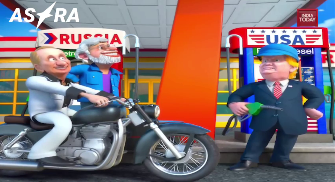 Апофеозом ролика является фрагмент, когда герои мультика на мотоцикле подъезжают к бензоколонке с надписью "Россия" и начинают заправляться. Рядом находится колонка "США", возле которой стоит президент Дональд Трамп недовольный тем, что Индия не покупает нефтепродукты у Америки.