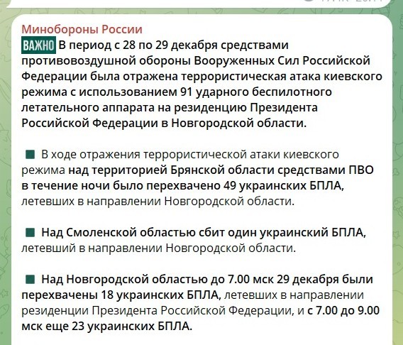 Минобороны РФ уверяет, что "над территорией Брянской области средствами ПВО в течение ночи было перехвачено 49 украинских БПЛА, летевших в направлении Новгородской области", "над Смоленской областью сбит один украинский БПЛА, летевший в направлении Новгородской области", "над Новгородской областью до 7.00 мск 29 декабря были перехвачены 18 украинских БПЛА, летевших в направлении резиденции президента Российской Федерации, и с 7.00 до 9.00 мск еще 23 украинских БПЛА".