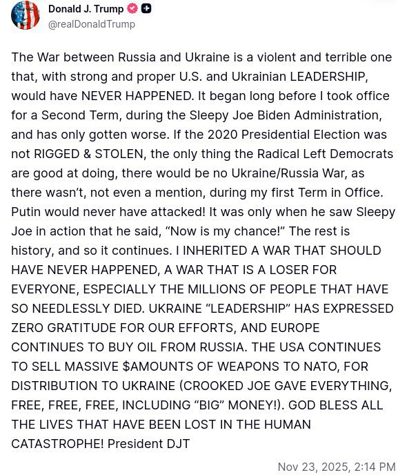 "В то время, как в Женеве встречаются делегации США, Украины и европейских стран, президент США в своей соцсети Truth Social снова стал критиковать Киев", - сообщает 23 ноября ВВС.