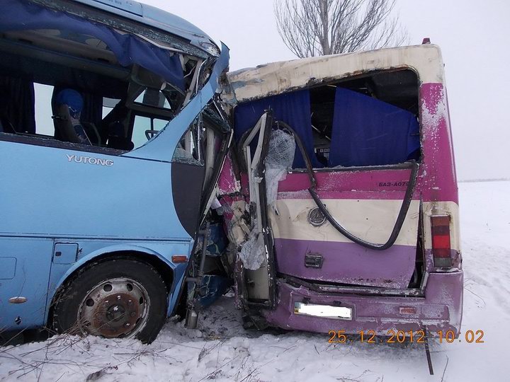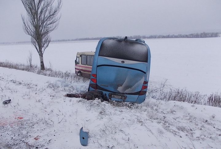 По данным областного ГАИ, со стороны Донецка в направлении Мариуполя двигался автобус "Ютонг" (Yutong), водитель которого по предварительной версии, не выбрал безопасную скорость движения отвлекся от управления и выехал на обочину дороги, где совершил наезд на стоящий на обочине дороги другой автобус "БАЗ", водитель которого находился рядом с этим автобусом и чистил стекла от снега.