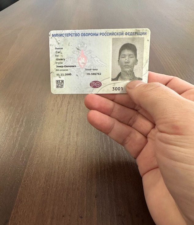 В частности, опубликован военный билет россиянина, на котором указано, что его зовут Сат Шойгу Эмер-Оолович, он родился 1 ноября 2000 года. Личный номер - УК586762, а билет выдан военкоматом Республики Хакасия.
