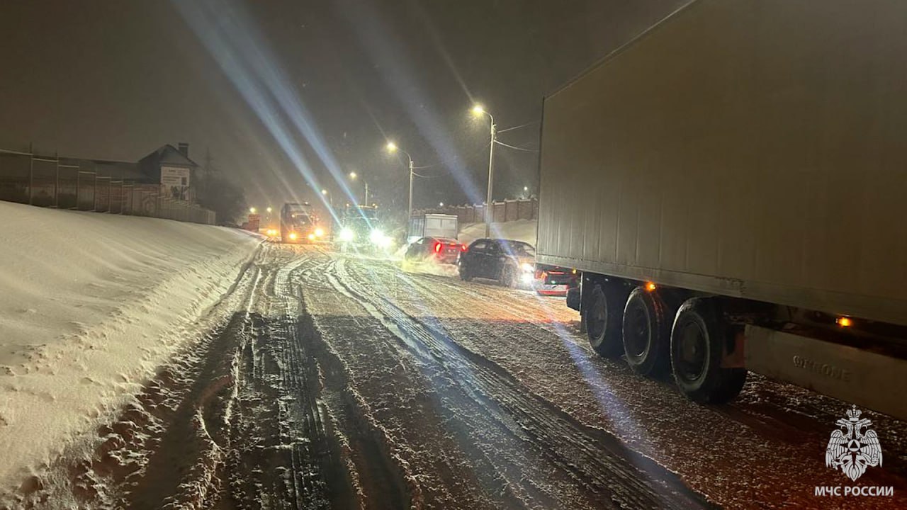 Отмечается, что для разблокировки движения было отбуксировано 11 большегрузов.