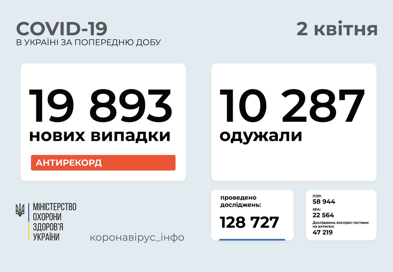 В Украине за прошлые сутки зафиксированы 19 893 новых случая коронавирусной болезни COVID-19. Об этом сообщает министр здравоохранения Максим Степанов в Facebook.