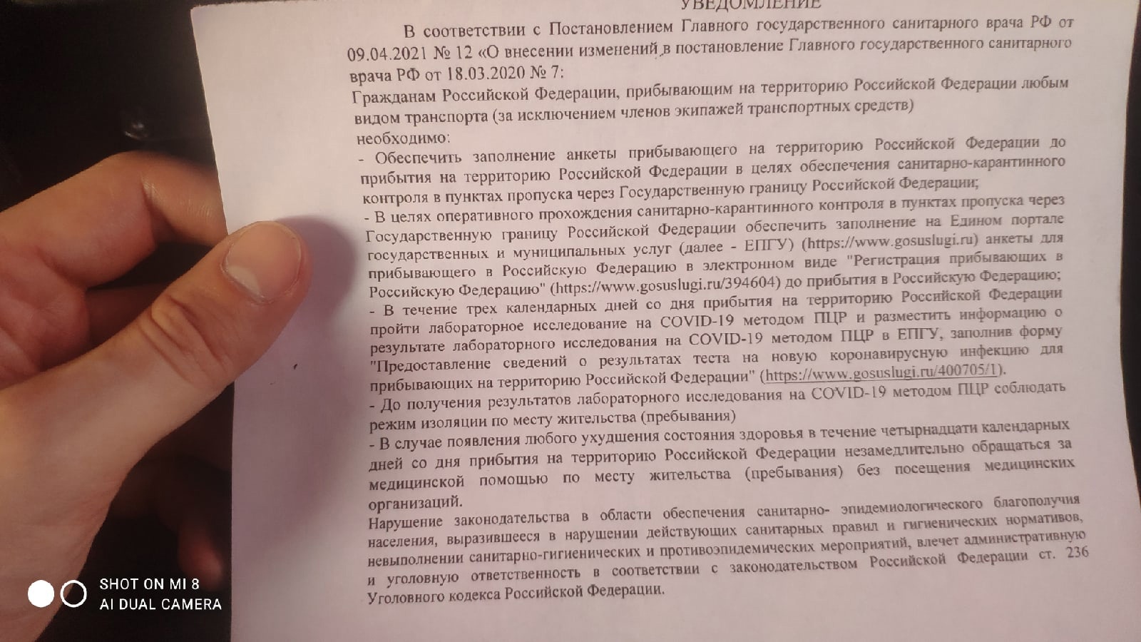Среди них: до прибытия заполнить анкету прибывающего на территорию Российской Федерации на Едином портале государственных и муниципальных услуг; в течение трех календарных дней со дня прибытия на территорию Российской Федерации пройти лабораторное исследование на COVID-19 методом ПЦР и разместить информацию о результате на портале Госуслуги; до получения результатов лабораторного исследования на COVID-19 методом ПЦР соблюдать режим изоляции по месту жительства (пребывания).