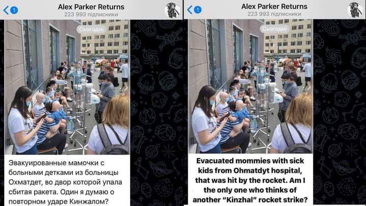 Российский телеграм-канал Alex Parker Returns после ракетного удара российской армии по детской больнице в Киеве "Охматдет" опубликовал фото украинских женщин с детьми, которые под стенами медучреждения продолжают принимать медицинские процедуры, с фашистским комментарием о желании повторно запустить ракету.