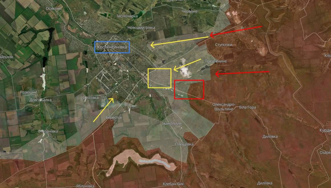 Аналитики отмечают, что дополнительным направлением давления россиян являются юго-западные окраины Константиновки в районе населенных пунктов Бересток и Ильиновка.