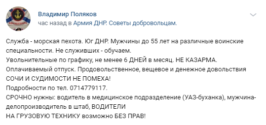 "Служба - морская пехота. Юг ДНР. Мужчины до 55 лет на различные воинские специальности. Не служивших - обучаем. Увольнительные по графику, не менее 6 ДНЕЙ в месяц. НЕ КАЗАРМА. Оплачиваемый отпуск. Продовольственное, вещевое и денежное довольствия. СОЧИ (самовольное оставление службы – "ОстроВ") И СУДИМОСТИ НЕ ПОМЕХА!", - говорится в одном из них.