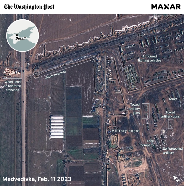 В своей оценке Африк опирается на спутниковые снимки, которые были сделаны за период с 11 февраля по 16 марта. Помимо этого на фото попали оборонные сооружения, которые оккупанты возвели в районе Медведевки.