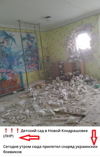 Так, очевидный факт попадания снаряда, выпущенного боевиками "ЛНР", в игровую комнату детского сада в этих публикациях представляют с точностью до наоборот.