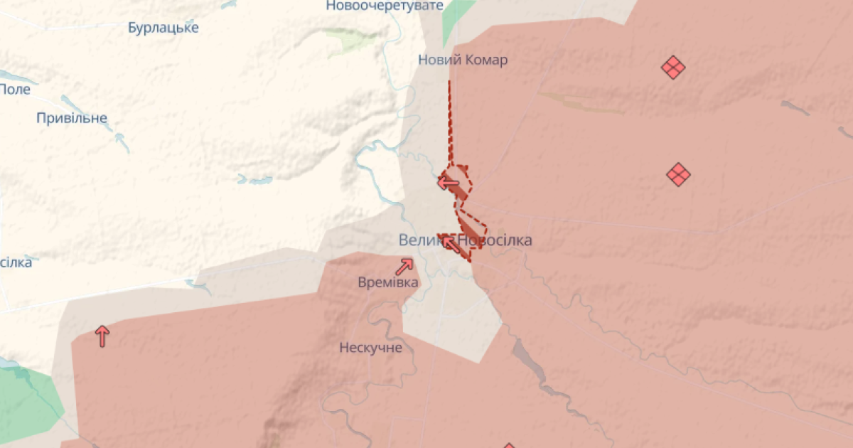 «Противник имеет успех в продвижении на восточных окраинах, а также занял небольшую часть центральных улиц населенного пункта, где они снимали свои видео с тряпками. Также пробует давить с юга и со стороны Временки, применяя огромное количество ресурсов, в частности, пехоты и техники. Одновременно с этим, ситуация вокруг поселка сложная и можно констатировать, что битва за Великую Новоселку подходит к концу», - отметили в DeepState.