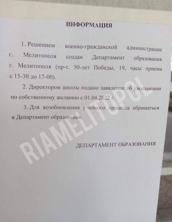 Первым решением "департамента" стало увольнение 1 апреля 2022 года директоров всех школ Мелитополя.