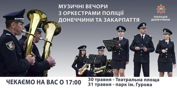 "30 и 31 мая на открытых площадках для жителей и гостей города выступят два оркестра - полиции Донецкой и Закарпатской областей. Творческие мероприятия являются частью проекта «Схід та Захід – разом», который берет начало в 2015-м и уже два года подряд объединяет полицейских и детей двух регионов страны", - говорится в сообщении.