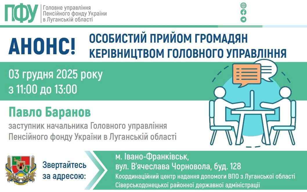 «В среду в Ивано-Франковске будет возможность проконсультироваться у руководства ПФУ Луганщины. 3 декабря в местном хабе Северскодонецкой РГА состоится личный прием заместителя начальника Главного управления Пенсионного фонда Украины в Луганской области Павла Баранова», - сообщила Луганская ОВА в соцсетях 2 декабря.