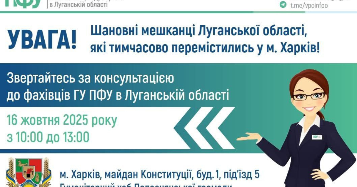 <p style="text-align: justify;">"В четверг, 16 октября, в хабе Попаснянской общины жителей нашего региона будет консультировать специалист ГУ ПФУ в Луганской области", - сообщила Луганская ОВА в соцсетях 15 октября. </p> <p style="text-align: justify;">Прием будет проходить с 10:00 до 13:00 по адресу: г. Харьков, площадь Конституции, д. 1, подъезд 5.</p> <p style="text-align: justify;">Ранее сообщалось, что <a href="/news/pereselentsiv-z-luganshhyny-v-odesi-konsultuvatymut-shhodo-pensij-subsydij-i-pilg-i535392" target="_blank" rel="noopener">переселенцев из Луганской области в Одессе будут консультировать по вопросам пенсий, субсидий и льгот.</a></p>