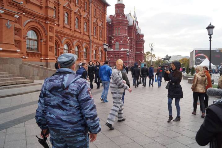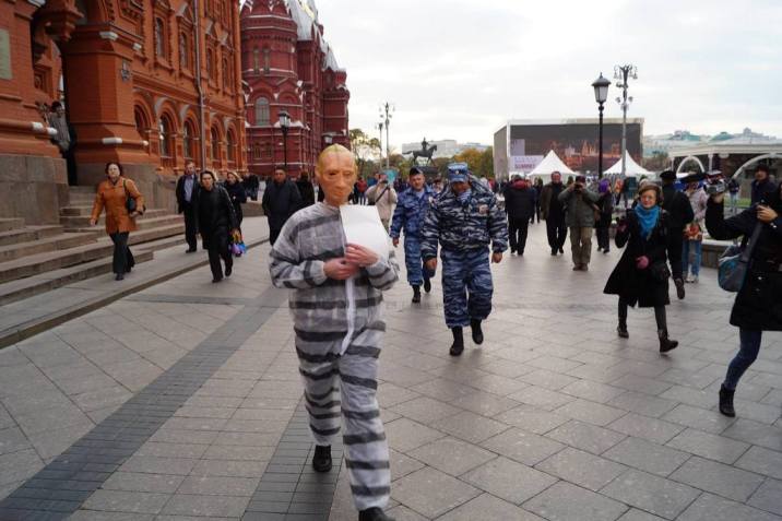 В центре Москвы 7 октября разгуливал мужчина в одежде заключенного с табличкой "военный преступник" на шее. Об этом сообщает "Обозреватель" со ссылкой на сообщения очевидцев в социальных сетях.
