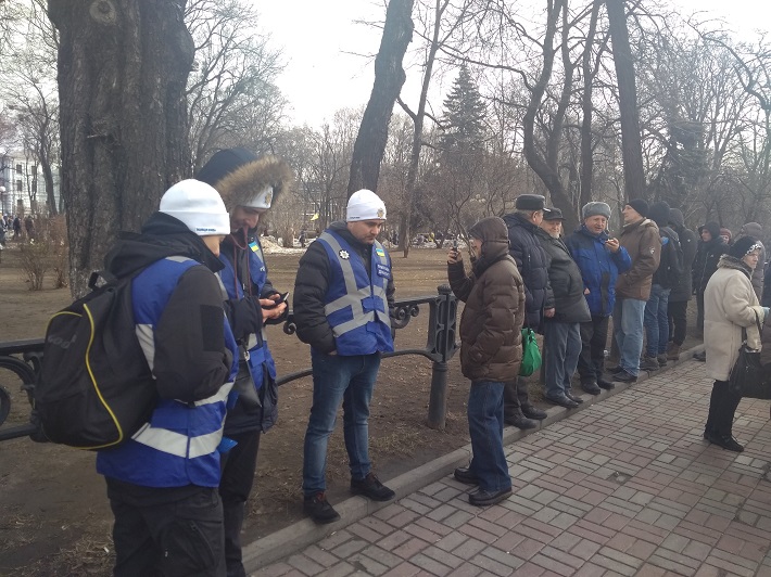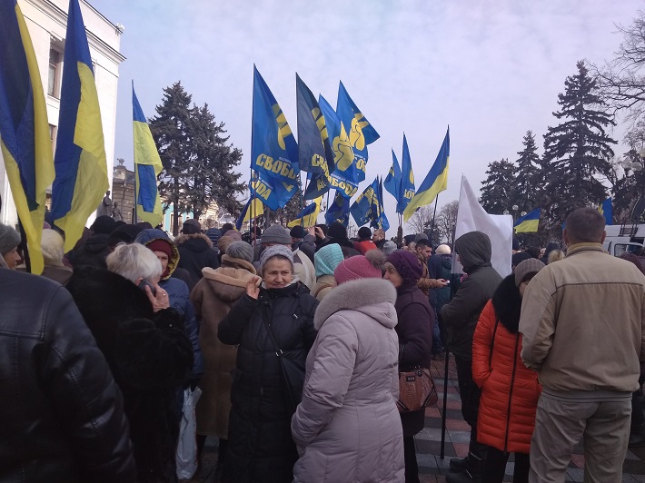 Среди протестующих люди преимущественно среднего и пожилого возраста. Некоторые держат плакаты "Закон про імпичмент - гарантія державності України", и флаги Всеукраинского объединения "Свобода". Митингующие периодически кричат: "Импичмент".